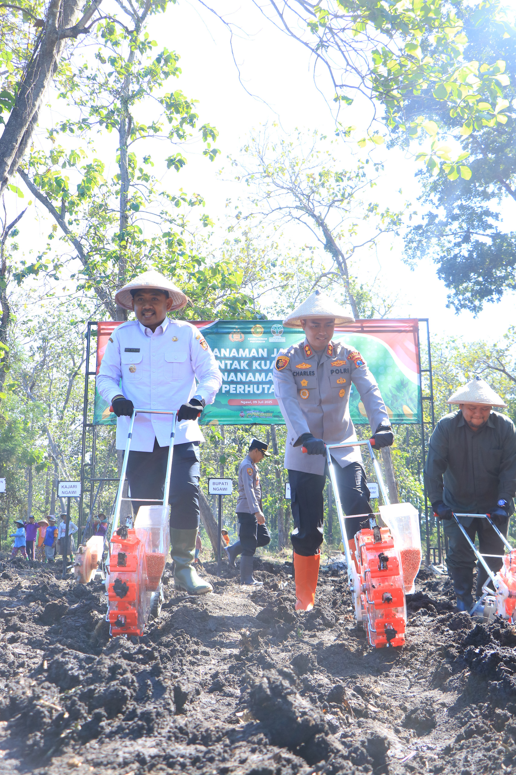 Kapolres dan Bupati serta Forkopimda Ngawi bersama dengan kelompok tani juga mahasiswa UGM yang sedang KKN, melakukan penanaman jagung di lahan yang telah disiapkan.