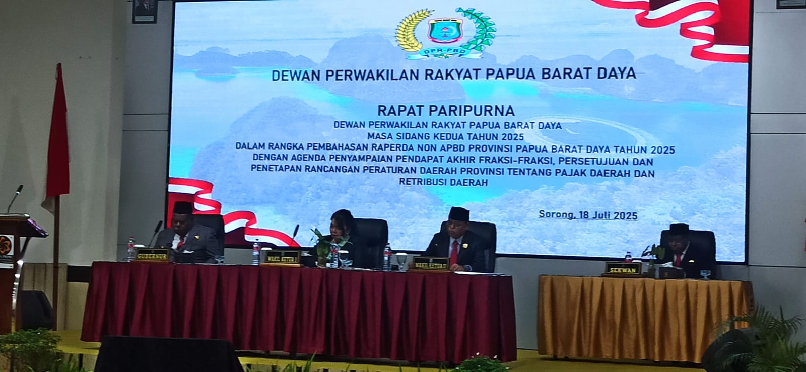 SORONG PBD, BUSERJATIM.COM GROUP — DPR Papua Barat Daya resmi menetapkan Raperda tentang Pajak Daerah dan Retribusi Daerah dalam Rapat Paripurna ke-2 Tahun Sidang 2025. Rapat yang dilaksanakan di Hotel Vega, Sorong, pada Jumat (18/7/2025), dipimpin langsung oleh Wakil Ketua I DPR Anike Makatut dan Wakil Ketua II Fredy Marlisa.