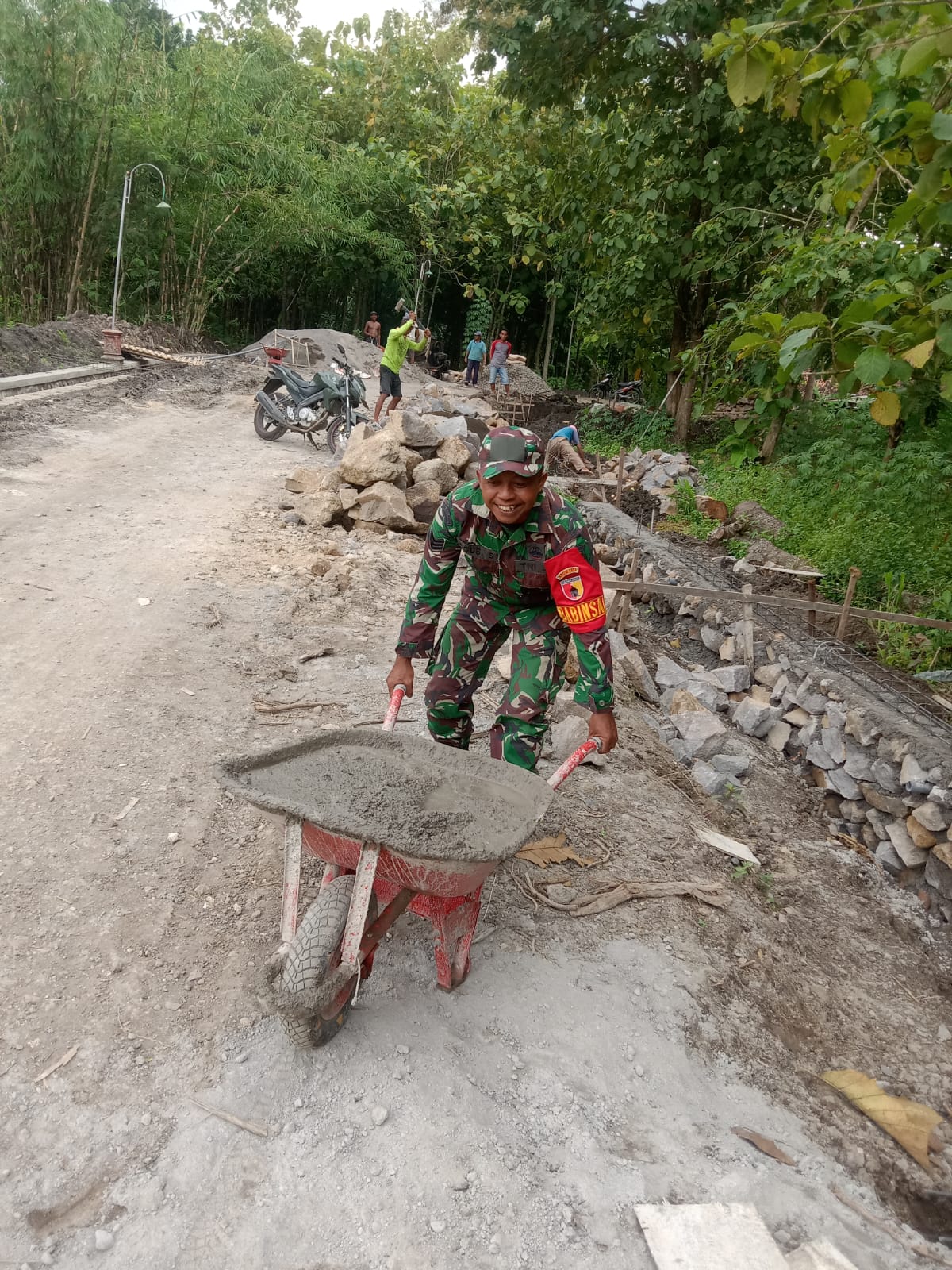 MADIUN, BUSERJATIM.COM GROUP Serka Agus Supriyanto, Babinsa Desa Ngale dari Koramil 0803/10 Pilangkenceng, melaksanakan kegiatan kerja bhakti bersama warga RT 14 Dusun Sumbang, Desa Ngale, Kecamatan Pilangkenceng, Kabupaten Madiun, Minggu (20/7). Kegiatan ini dilakukan dalam rangka pembuatan talut penahan tanah di sepanjang jalan desa.