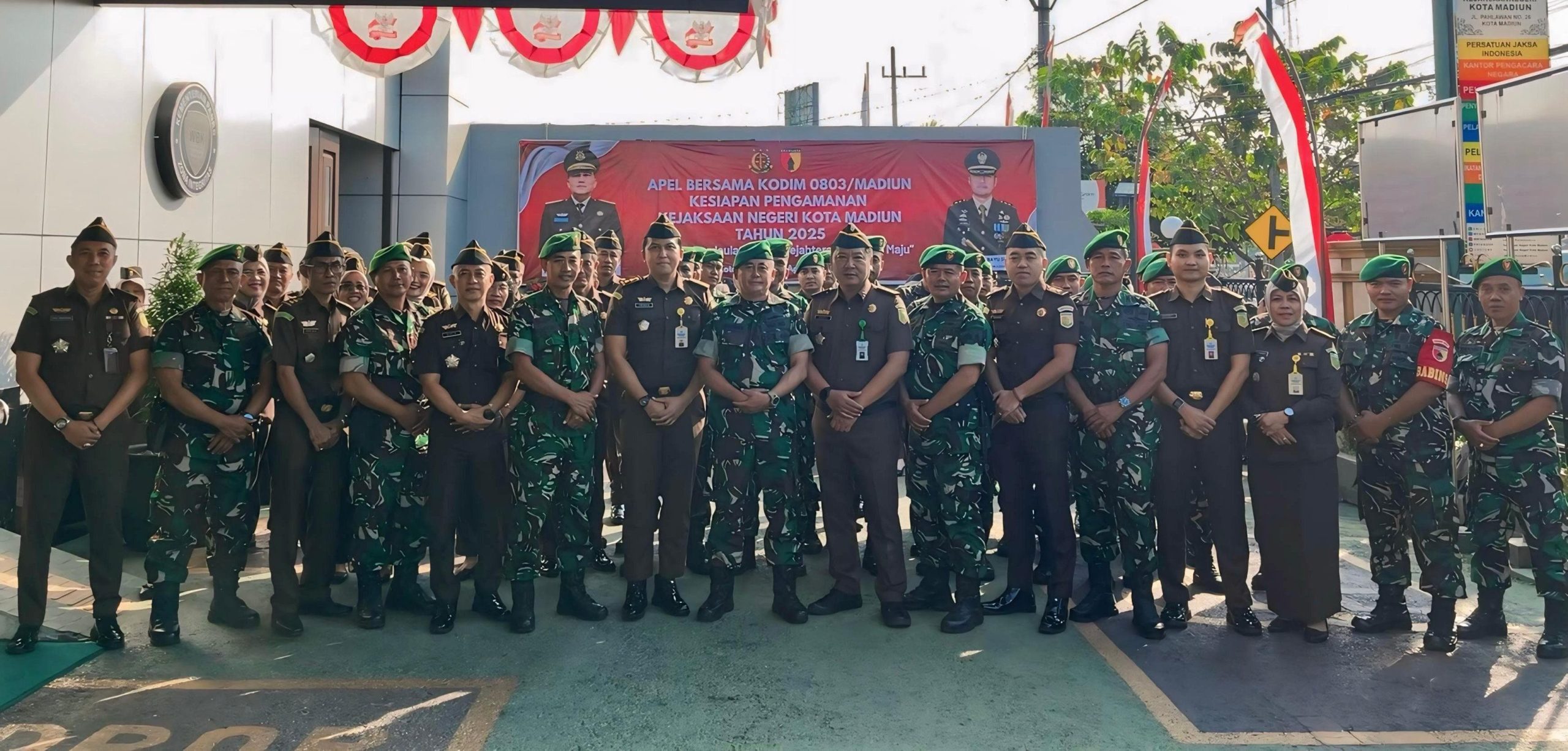 MADIUN, BUSERJATIM.COM GROUP – Anggota Kodim 0803/Madiun dipimpin langsung oleh Kasdim 0803/Madiun, Mayor Inf Suwandi, mengikuti Apel Gelar Pengamanan di halaman kantor Kejaksaan Negeri Kota Madiun, Senin (25/8/2025).