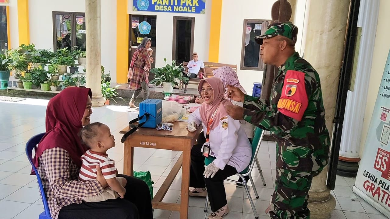 MADIUN, BUSERJATIM.COM GROUP – Babinsa Desa Ngale, Koramil 0803-17/Pilangkenceng, Serka Agus Supriyanto, turut mendampingi kegiatan imunisasi balita yang digelar di Balai Desa Ngale, Kecamatan Pilangkenceng, Kabupaten Madiun, Minggu (31/8/2025).