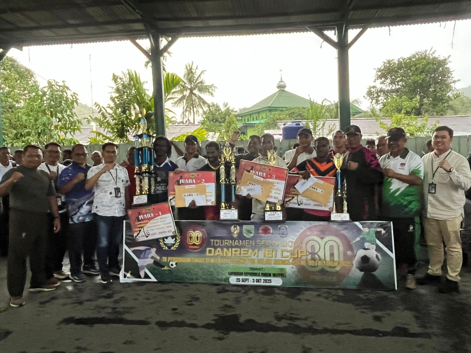 SORONG PBD, BUSERJATIM.COM GROUP – Turnamen sepak bola Danrem Cup 2025 yang digelar oleh Korem 181/Praja Vira Tama resmi ditutup dengan sukses pada Jum’at (03/10), menandai puncak rangkaian peringatan Hari Ulang Tahun Tentara Nasional Indonesia (HUT TNI) ke-80 tahun 2025. Dalam pertandingan final yang berlangsung sengit, tim Universitas Pendidikan Muhammadiyah (Unimuda) Sorong keluar sebagai juara pertama, mengukuhkan diri sebagai yang terbaik di antara 14 perguruan tinggi yang berpartisipasi.