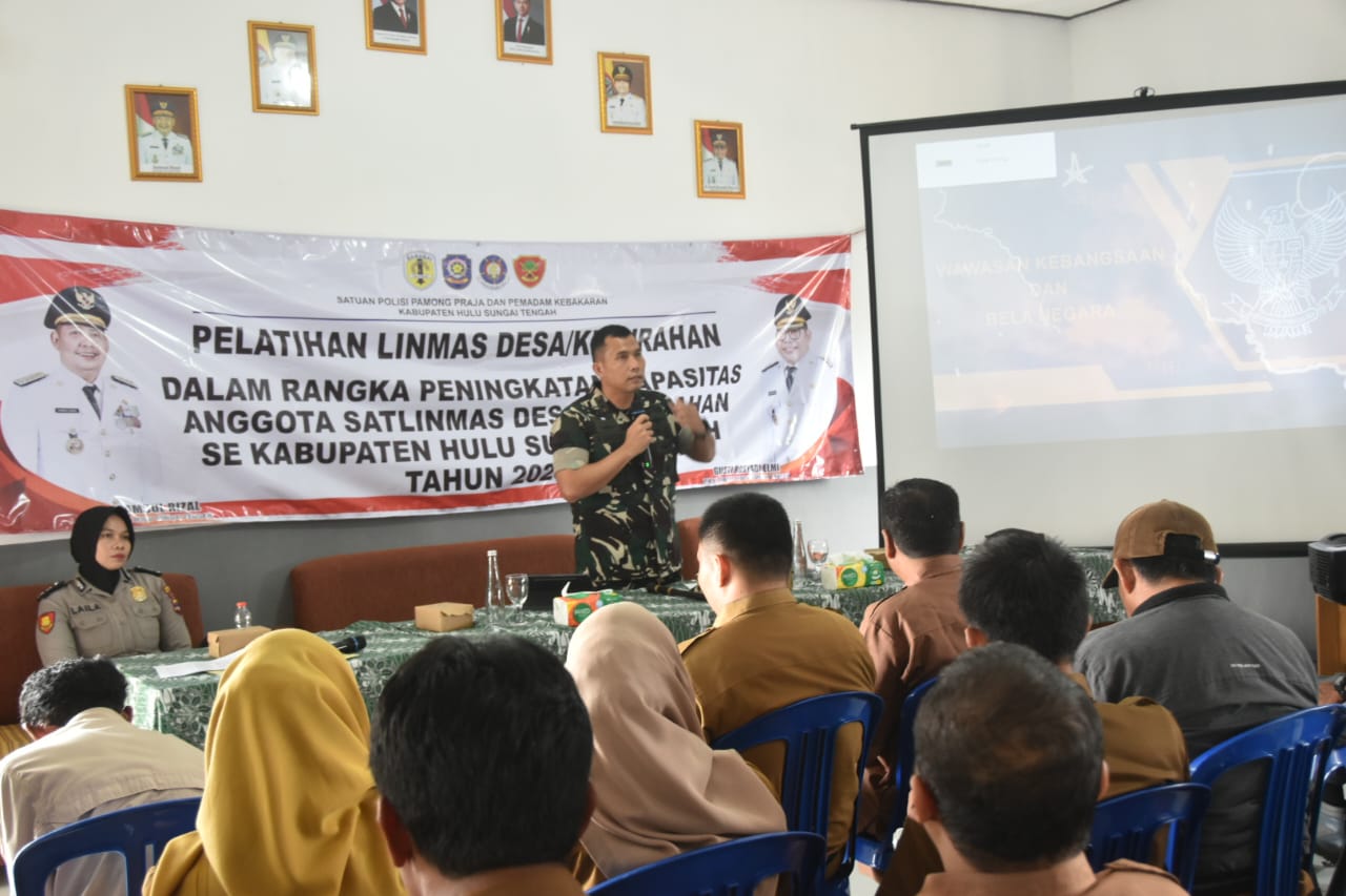 BARABAI, BUSERJATIM.COM GROUP – Komandan Kodim 1002/HST Letkol Inf Ardiansyah Okta Putra Siregar memberikan materi Bela Negara pada kegiatan Pelatihan Linmas Desa/Kelurahan dalam rangka meningkatkan kapasitas anggota Satlinmas se-Kecamatan Barabai Dan Pandawa. Kegiatan tersebut berlangsung di Aula Kantor Desa Benawa Tengah, Kecamatan Barabai, Senin (24/11/2025).