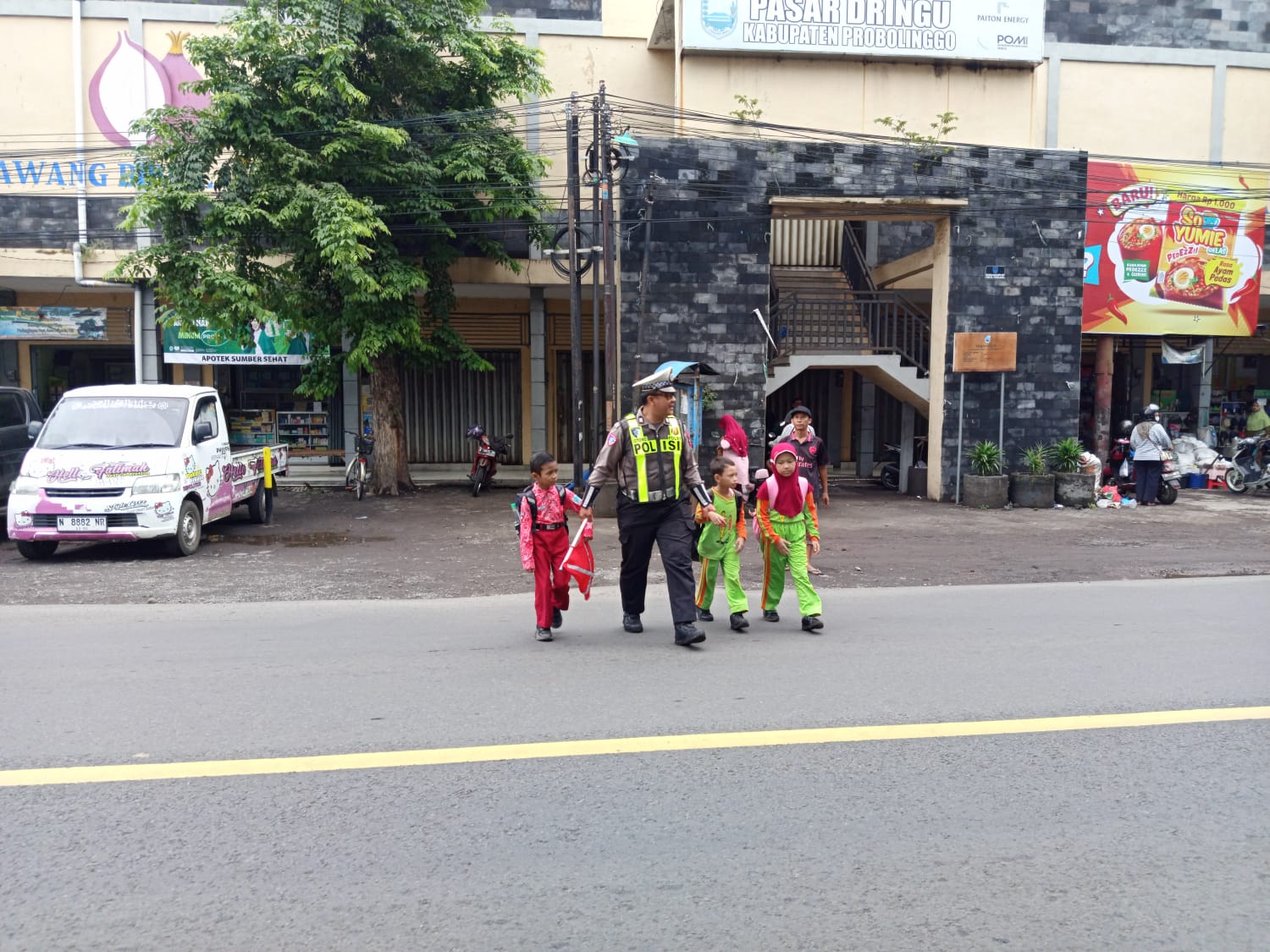 Anggota Satlantas Polres Probolinggo Aipda Amiruddin saat bertugas di Jalan Raya Panglima Sudirman Kraksaan mengatakan kegiatan poros pagi ini beberapa anggota dipusatkan di tempat titik kumpulnya masyarakat pagi hari yang melakukan aktifitas seperti berangkat kerja , sekolah maupun ke pasar.