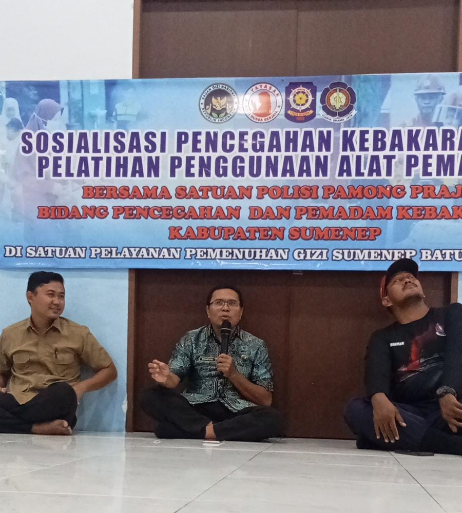 Kepala SPPG Sumenep Batuan Batuan, Matlimin dalam sambutannya menyampaikan bahwa dapur operasional memiliki risiko tinggi terhadap potensi kebakaran akibat penggunaan kompor gas, peralatan listrik, serta aktivitas memasak dalam skala besar. Oleh karena itu, pelatihan ini dinilai sangat penting untuk meminimalkan risiko dan memastikan keamanan seluruh pegawai.