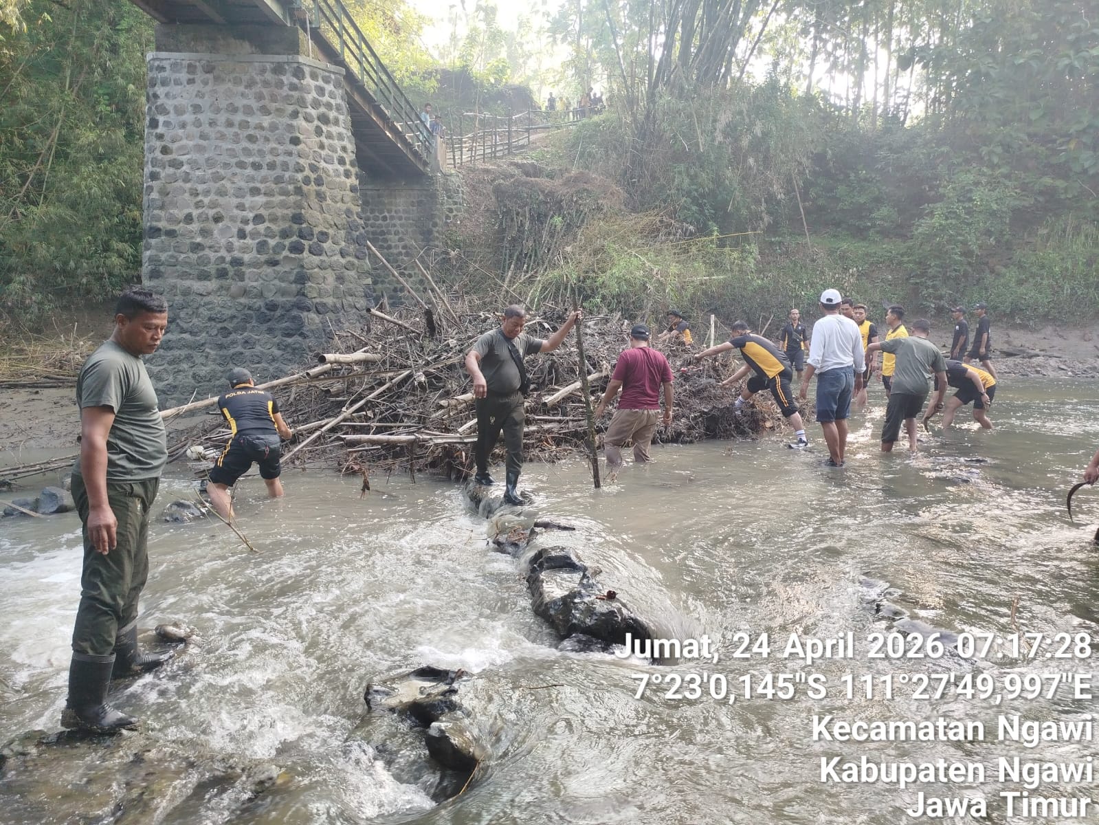 NGAWI, BUSERJATIM.COM GROUP – Wujud kepedulian terhadap lingkungan ditunjukkan oleh berbagai unsur di Kecamatan Ngawi Kota melalui kegiatan kerja bakti pembersihan sungai yang dilaksanakan di Dusun Blandongan, Desa Ngawi, Kec. Ngawi, Kabupaten Ngawi. Kegiatan ini melibatkan anggota Koramil 01 Ngawi, Polres Ngawi, Badan Penanggulangan Bencana Daerah (BPBD), serta masyarakat setempat. Jum’at (24/4/2026).