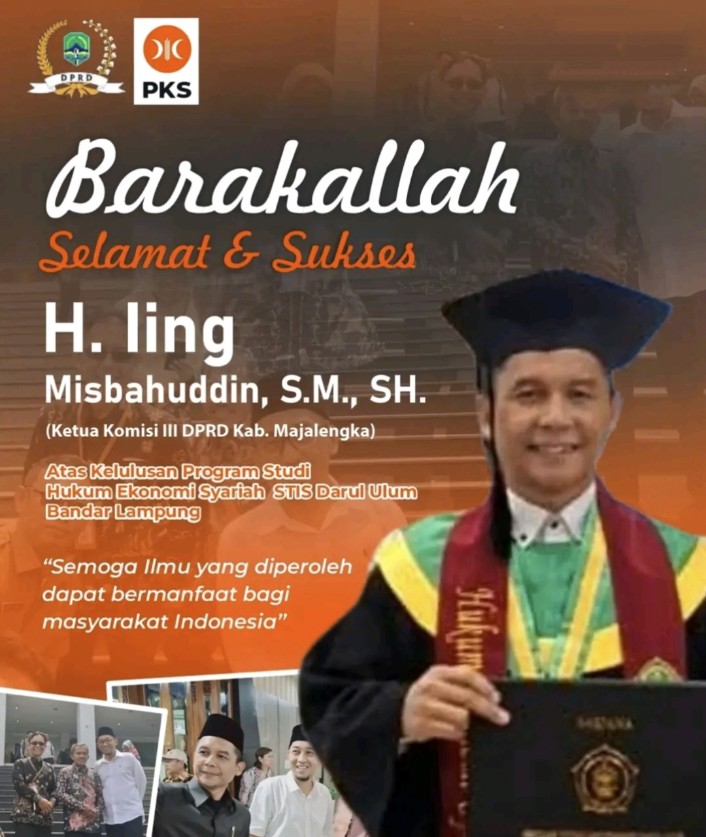 Majalengka – Komisi III DPRD (Dewan Perwakilan Rakyat Daerah) Majalengka H. Iing Misbahuddin, S.M., S.H. mendapatkan gelar baru Sarjana Hukum (S.H.) setelah lulus dari STIS Darul Ulum Bandar Lampung saat masih menjabat anggota DPRD Majalengka. Hal ini menunjukkan upaya peningkatan kapasitas diri di tengah kesibukan mengemban amanah rakyat.